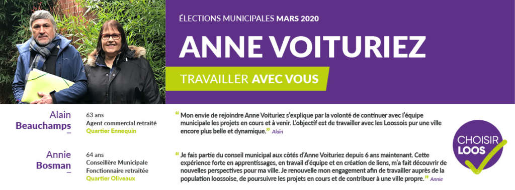 Annie : Je fais partie du conseil municipal aux côtés d’Anne Voituriez depuis 6 ans maintenant. Cette expérience forte en apprentissages, en travail d’équipe et en création de liens, m’a fait découvrir de nouvelles perspectives pour ma ville. Je renouvelle mon engagement afin de travailler auprès de la population loossoise, de poursuivre les projets en cours et de contribuer à une propre.